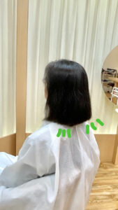 襟足は浮いてしまうクセがありましたので、首に沿う様に調整を入れ(黄緑矢印)、トップと凹凸のコントラストを作ることにより、頭の形をよく見せるようにカットさせて頂きました。