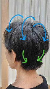 段を入れたり、毛量調整をして、トップの髪の毛がふんわりと自然に立ち上がる感じにしました(青矢印)。